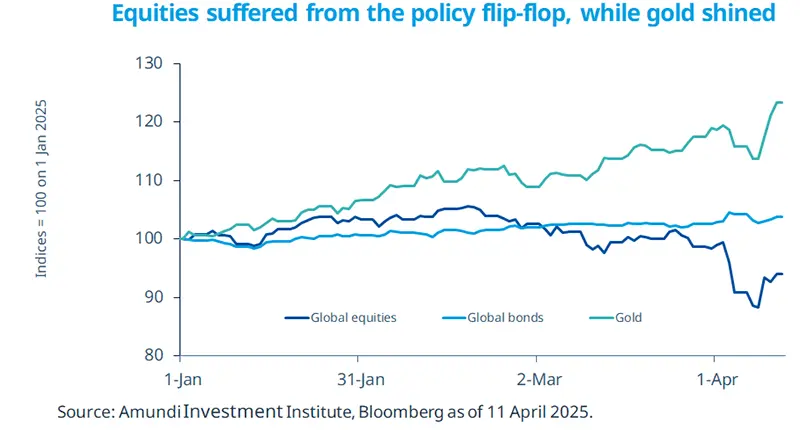 Over the past week, markets have experienced extreme uncertainty caused by US policy gyrations on tariffs. This uncertainty has started to weigh on US assets, including the dollar and US Treasuries. Despite the 90-day pause announced on 9 April, the US average tariff rate remains at a 100-year high, with rising US tariffs on China triggering retaliation from the latter. We are moving towards a rewiring of the global trade system that will have long-lasting implications for financial markets. In the China-US competition, Europe could benefit. Tariffs will affect the global economy through lower growth and higher inflation, ultimately impacting corporate profits. Against this backdrop, we believe investors should remain cautious, diversify* across markets and geographies, and consider gold.